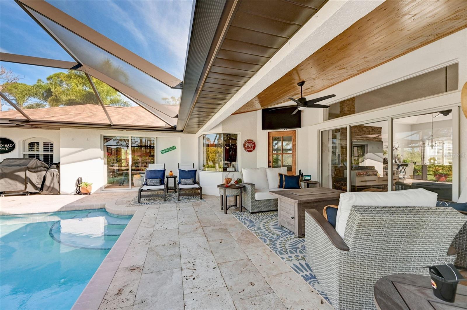 *** PRICE REDUCTION !!!Welcome to a breath of fresh air in this fully renovated home sitting on a quiet cul-de-sac. This custom home resides on two oversized private lots - over half an acre - within minutes to world class beaches, golf, shopping and sailing on Boca Grande, Englewood Beach, Punta Gorda and Sarasota. Home features more than 90 palms for extra privacy, tranquil living and includes lemon trees, papaya, and several birds of paradise. Rich in character and charm, this home has been totally upgraded with high end finishes and meticulous attention to detail. Chicago brick and stacked stone columns line the driveway to the three-car garage and lead you into the home. Both the front entry and lanai have in-laid Travertine stone. Inside you find stacked stone in several areas; new hardwood flooring connecting a very open floor plan; new granite countertops and backsplash in the kitchen and both baths. Main bedroom/bath has Mahogany French doors opening to the lanai and features a walk-in shower, free standing Kohler tub, Cypress ceiling and trim, and double sinks in an oversized vanity. Double walk-in closets offer custom shelving and drawers. On the opposite side of the home, a Virginia Ledge Stone walk-in shower with a pebbled stone floor is in the guest bath adjacent to the kitchen and lanai, nestled between the two guest rooms. The two guest rooms accommodate king sized beds and have bay windows. The back guest room has recessed sliders which fully open to the lanai and can serve as either a bedroom or flex space and has full walk-in custom closet. The kitchen is open to the main living area and centrally located, offering abundant cabinetry and counter space, while the aquarium window gives a full view of the pool and palms surrounding you. There is a breakfast/dining nook in the kitchen with a full view of the pool, as well as a formal dining area/flex space in the front of the home. The main living area is spacious with fully opening, retracting sliders, allowing for easy entertaining while enjoying your lanai (with picture screen opening) and the heated, saltwater, self-cleaning pool. Step right outside your screened lanai and relax under the custom pergola, sit around the fire pit/grilling area, play a game of cornhole all while enjoying the south Florida sunsets. Plantation shutters throughout the home offer privacy when desired and hurricane rated windows survived Ian without a problem or the work of installing exterior hurricane protection! The garage has, new epoxy floors, and Clopay insulated, wind-rated garage doors. This home made it through Ian with no damage to the home and no leakage. The palms took a direct hit with the storm but are beginning to fully recover and make for a stunning paradise. The yard is easily maintained with new irrigation lines, pumps and a well for the sprinkler system, saving on water bills while easily maintaining the lush green grounds. Full attention to detail on this home. Ready for new owners to move in and immediately relax and enjoy all that south Florida has to offer! Last but not least, new roof, new gutters and home painted in May 2023. Truly a must see!