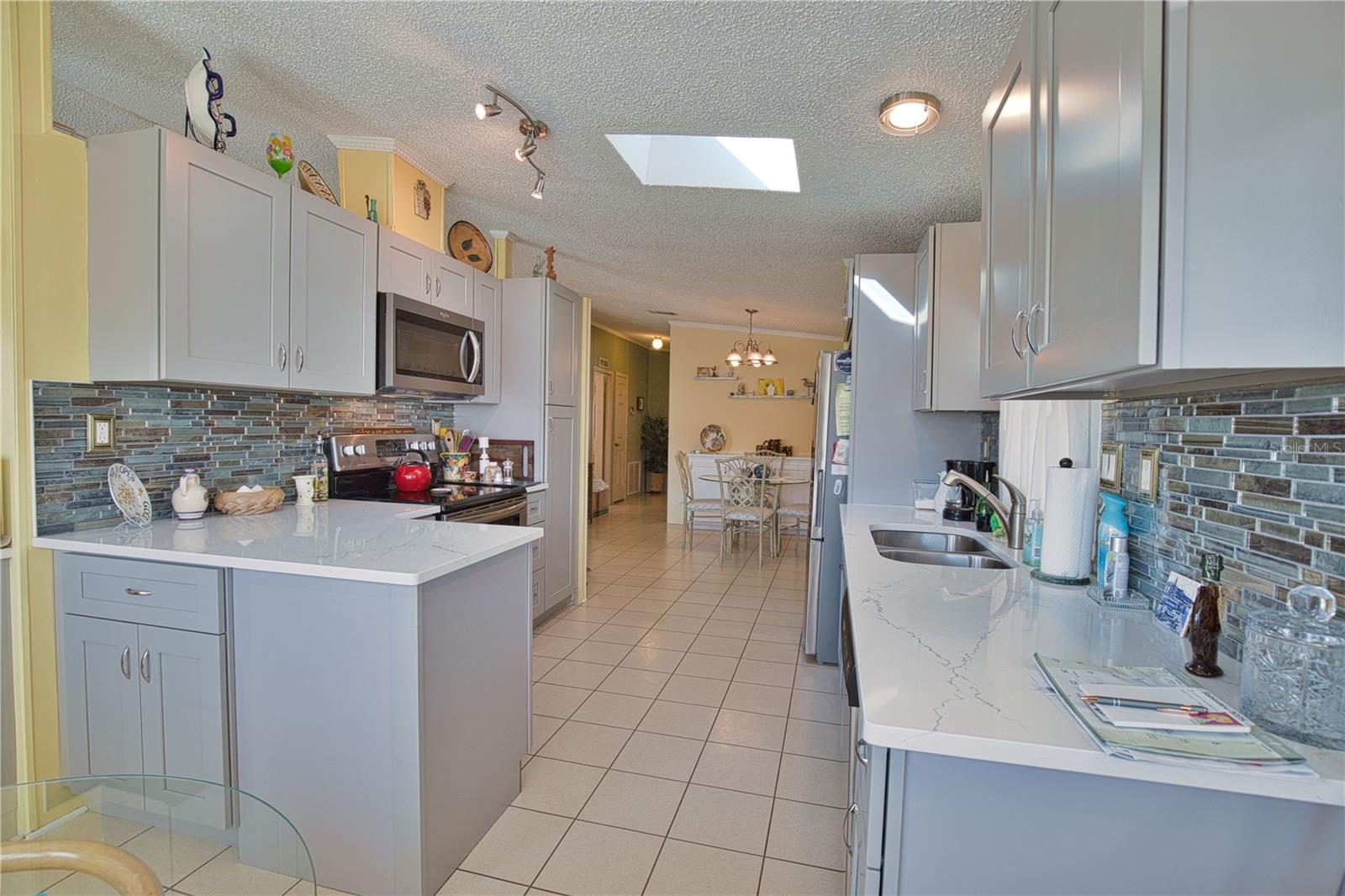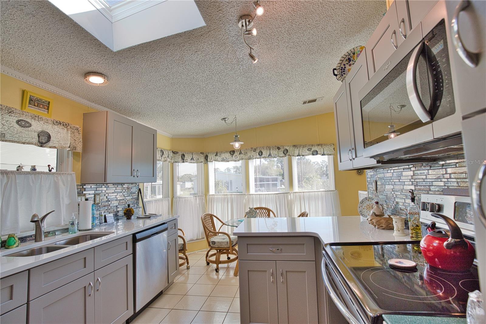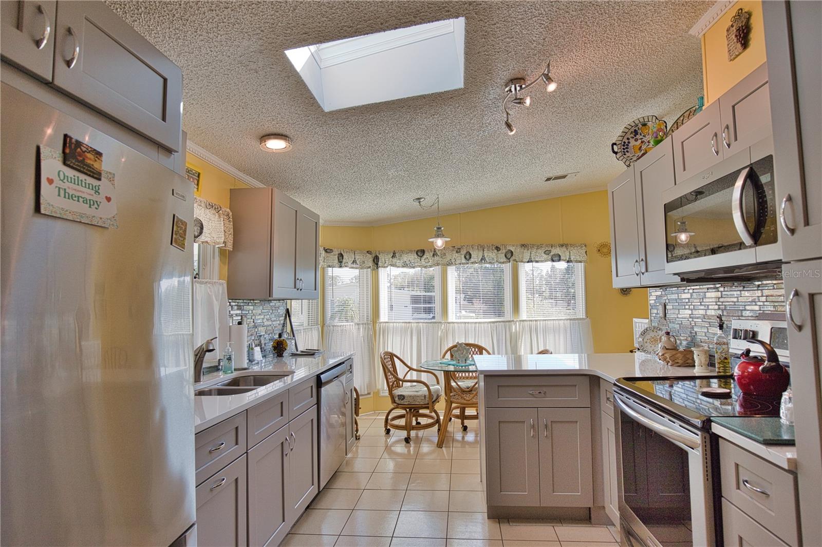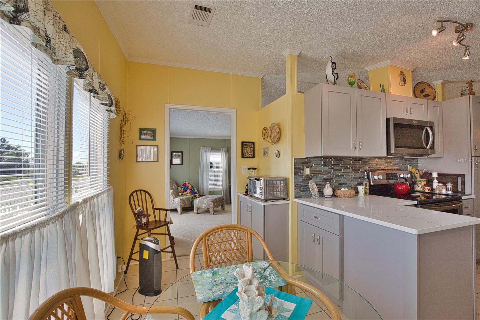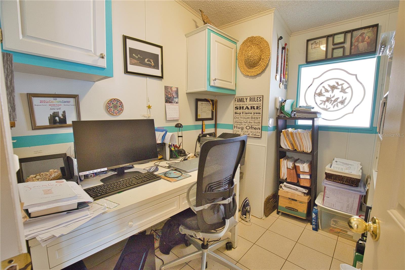 Look no further for your Florida Dream Home! This charming 2 bedroom, 2 bath house is located on a quiet street in a vibrant 55+ community. Enjoy your morning coffee or evening beverage on the front porch overlooking a small pond. On windy days you canenjoy the outdoors from the comfort of your lanai. Inside the home is bright and airy with lots of natural light. The eat-in kitchen has been beautifully updated with quartz countertops, glass backsplash and solid wood cabinets. This connects to the dining room which flows into the living room. Entertaining friends and family will be a breeze in this home. In addition to the living space, you'll find a bonus room currently utilized as an office. The bonus room, with washer/dryer hook-ups, could also be converted to a laundry room for convenience. The primary bedroom is extremely spacious with a completely updated ensuite bathroom featuring double sinks, a new soaking tub, and a new walk-in shower. New A/C 20211, A/C duct cleaned and sealed in 2023, new roof 2023, skylights 2023, new vapor barrier 2023, new high impact front doors 2024, new vinyl siding 2024. Home is being offered partially furnished. La Casa boasts 974 home sites nestled among a variety of native trees with spacious common grounds surrounding our eight lakes and offers the ultimate lifestyle on Florida's Gulf Coast. You'll be surrounded by hundreds of palms reaching for the sky and beautiful mature lush landscaping which demonstrates the utmost level of care our property receives from residents and management. La Casa is a friendly, family community. You will be away from the hustle and bustle except when you want to be part of it. When you leave our gates, North Port is only 1.5 miles from the city center, where you will find every kind of retail store and service you could need. Come for a visit to this self-contained oasis and see for yourself why La Casa is the ultimate destination for both snowbirds and year-round.