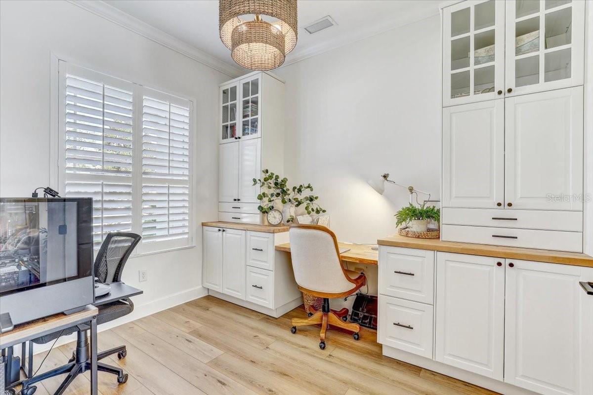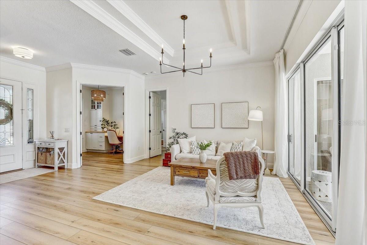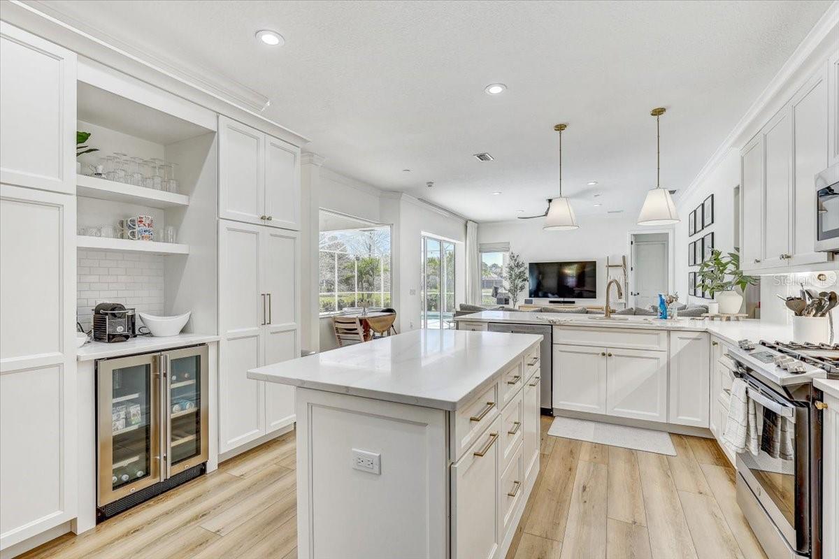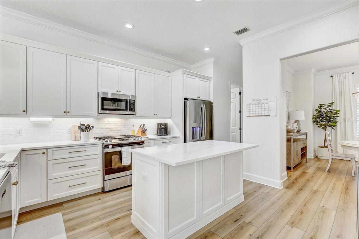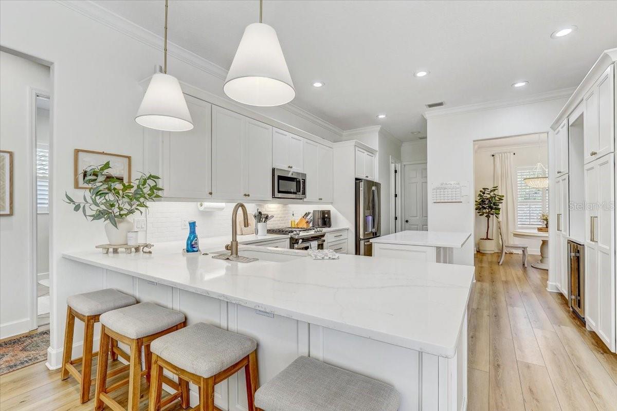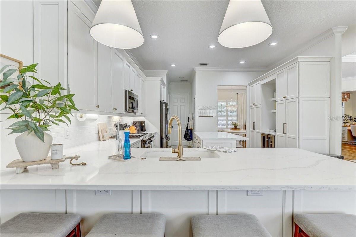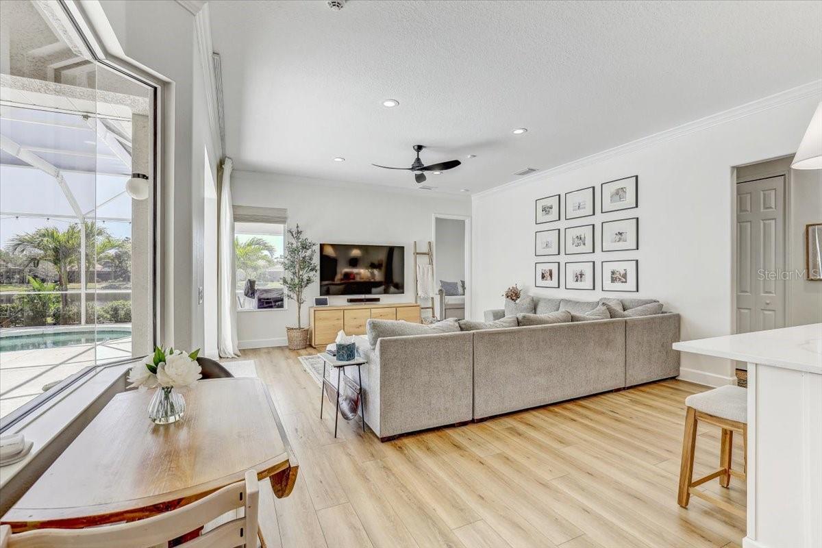 Welcome to this beautiful 4 BEDROOM + OFFICE, 3 BATH, 2 car garage POOL home with a POND VIEW located in the highly sought after neighborhood of Greenbrook Preserve in LAKEWOOD RANCH! This home is entirely move-in ready, just bring your belongings and settle right in! From the moment you arrive, you'll be impressed by this home's beautiful TILE ROOF, fresh landscaping, and gorgeous pond views. Enjoy Florida living at its finest with the home situated on a larger lot (.31 OF AN ACRE), two spacious covered outdoor patio areas, a heated in-ground POOL and SPA, and new pool screens installed in 2022, all perfect for entertaining or relaxing in your private oasis. The exterior was freshly painted in 2021, giving the home a modern, updated look. Step inside and fall in love with the LUXURY VINYL PLANK flooring and crown molding that flow seamlessly throughout the entire home which includes tasteful chandeliers. The CUSTOM GOURMET KITCHEN, fully upgraded in 2023, features quartz countertops, a large island, a quartz composite sink, elegant gold hardware, hanging Z-studio Pendants, gas stove, stainless steel appliances, wine fridge and a custom pantry for extra storage--a dream for any chef or entertainer! The primary suite offers a peaceful retreat with two closets (including a walk-in), a cozy bay window area, and higher ceilings that add to the airy, open feel. The spa-like master bath includes Corian counters, dual sinks, a garden tub, and a walk-in shower. Additional highlights include: PLANTATION SHUTTERS on most windows, Indoor laundry room with cabinets and a sink, Tile roof, Picturesque water views from your backyard oasis to enjoy sunsets and living the Florida lifestyle! Greenbrook has two parks, the county park and Adventure park. They feature ball fields, playground, dog park, pavilion, in-line skating and walking trails. Greenbrook is also located close to shopping, hospitals, golf, beaches, and I-75 for easy access to all the other amenities that the Sunshine State has to offer. Schedule your private tour today. This is a home and property that you do not want to miss!