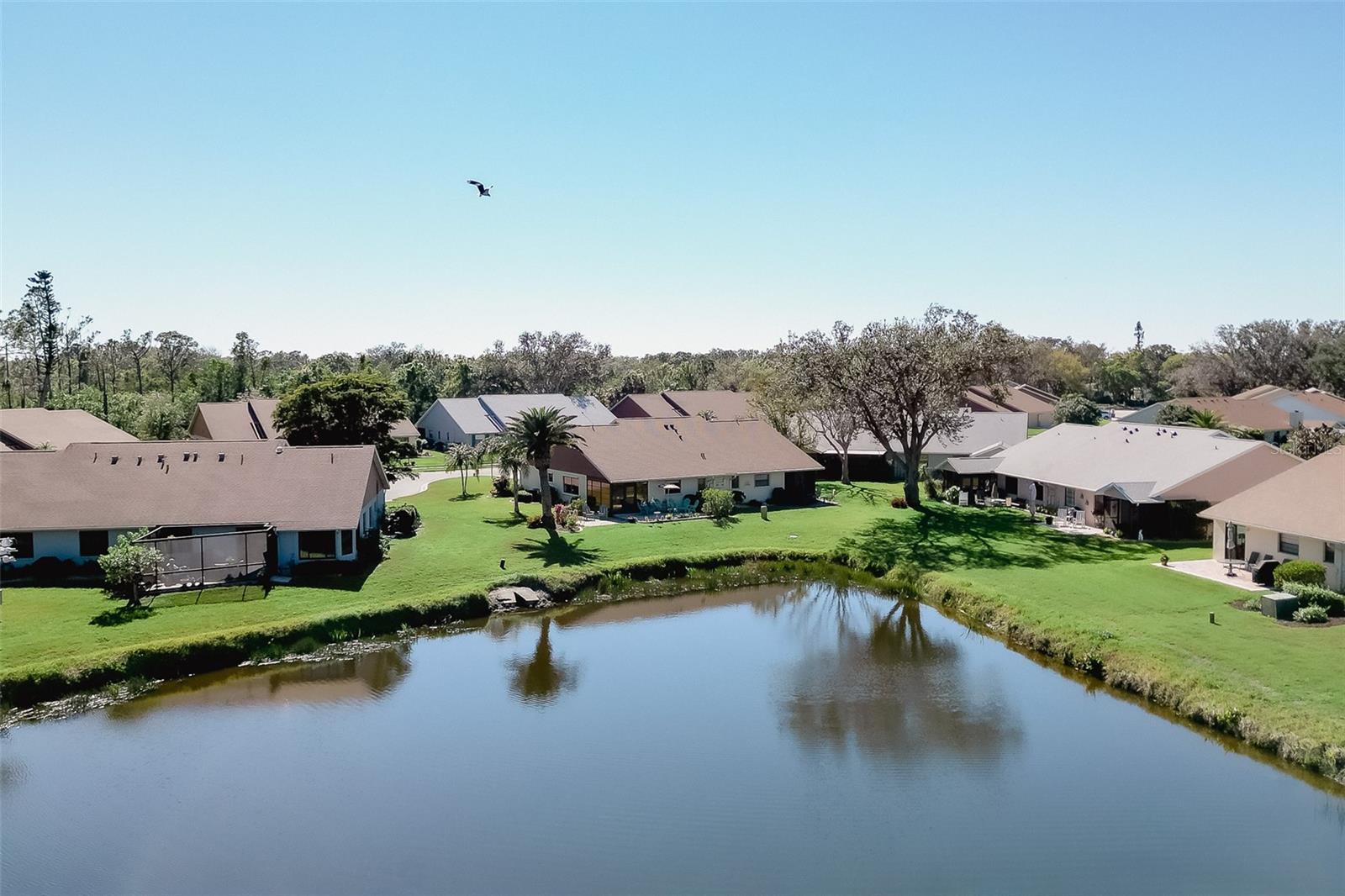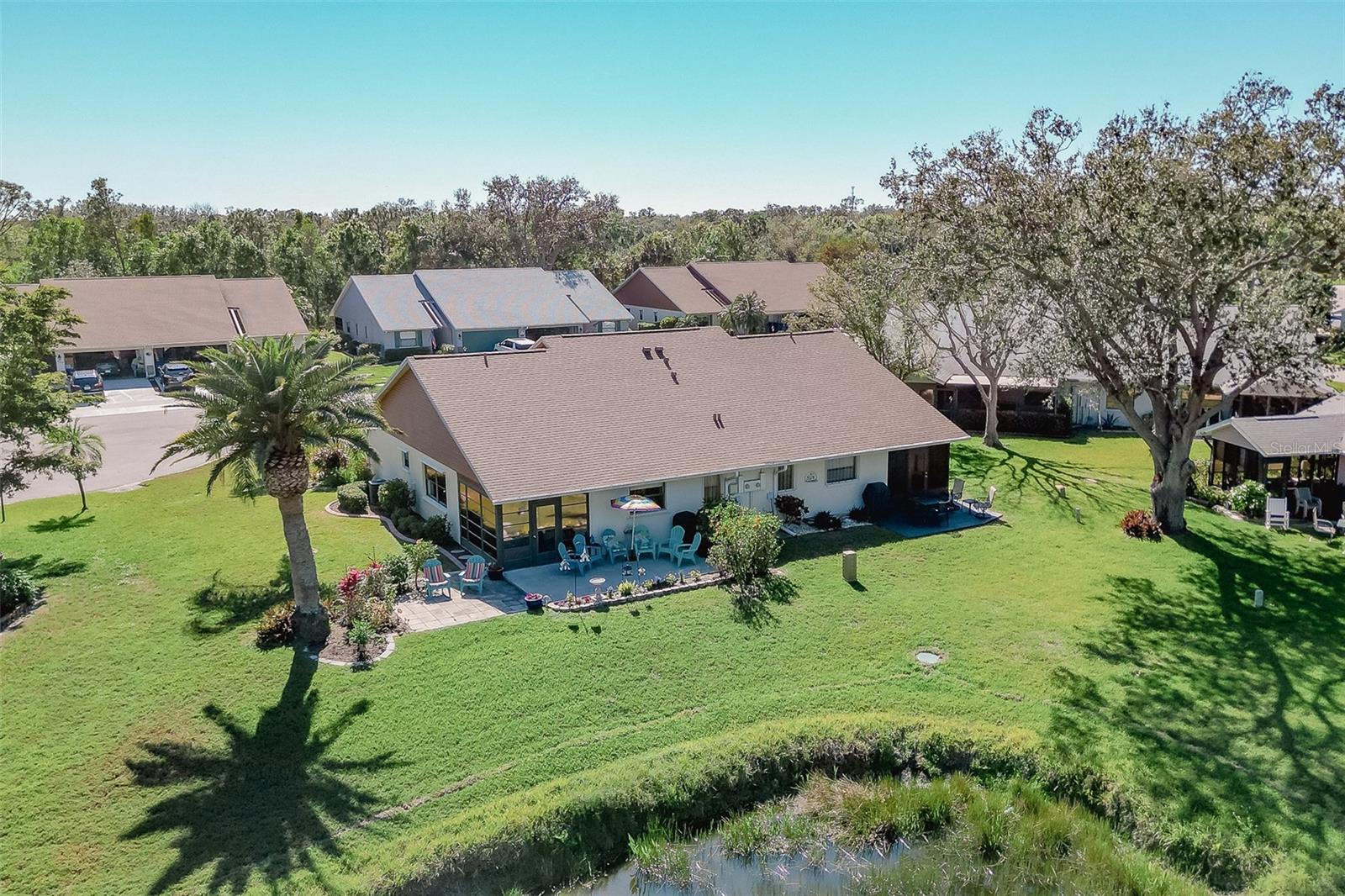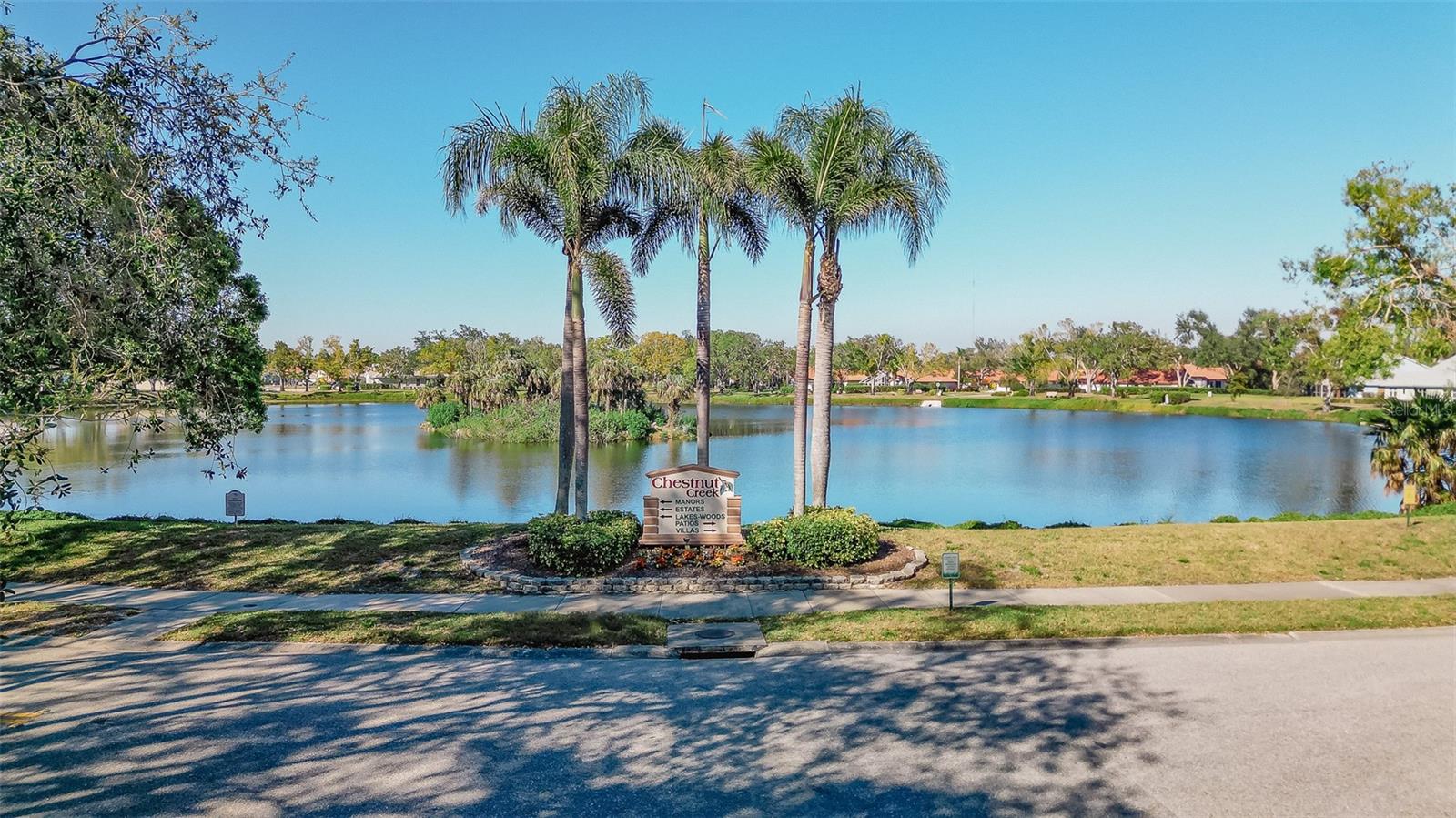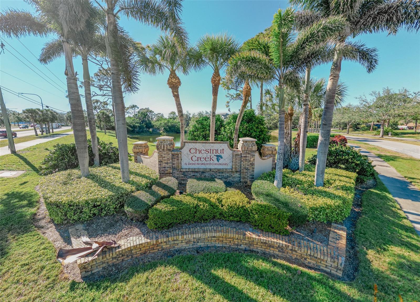Welcome to Chestnut Creek Villas, a highly regarded 55+ community known for its peaceful setting and convenient amenities. This well-maintained villa is tucked away on a quiet cul-de-sac, offering serene pond views backed by a lush nature preserve. The neighborhood's tree-lined streets create a welcoming atmosphere, great for leisurely like bike rides. Inside, the open floor plan features cathedral ceiling that enhance the bright and airy feel of the living space. Recent updates induce a new roof (2020), water header (2022), and appliances (2023), making this home move-in ready. The living area flows seamlessly into an enclosed lanai and out to a private patio - an ideal spot to enjoy your morning coffee while taking in the tranquil preserve views. Chestnut Creek offers great value with low HOA fees covering a community pool, tennis and bocce courts, shuffleboard, yard maintenance, and basic TV cable. The central pond attracts a variety of birds and wildlife, adding to the community's natural charm.