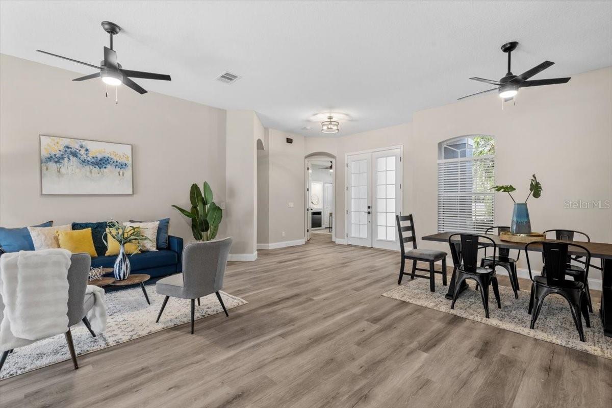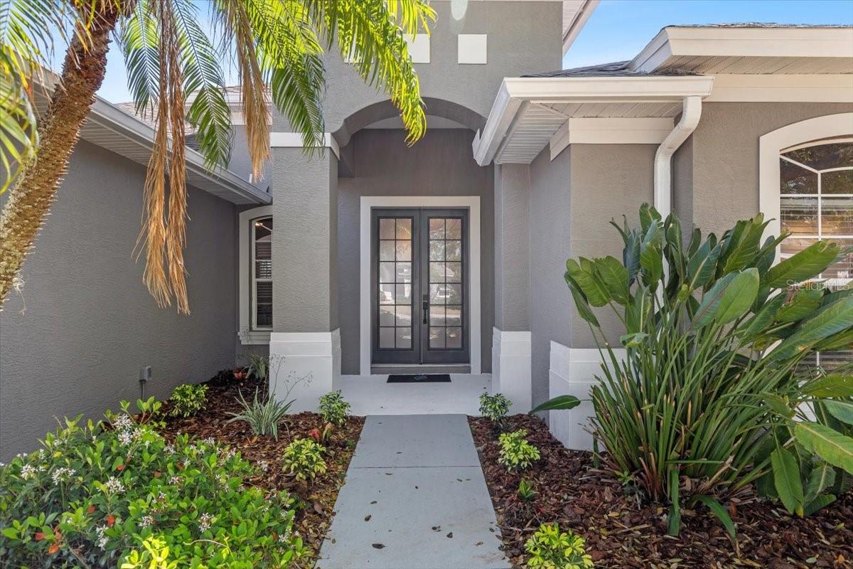 - Exterior: French Doors, Lighting, Rain Gutters, Sidewalk, Sliding Doors