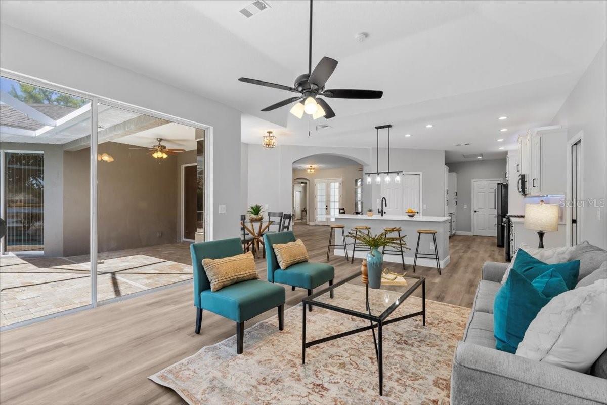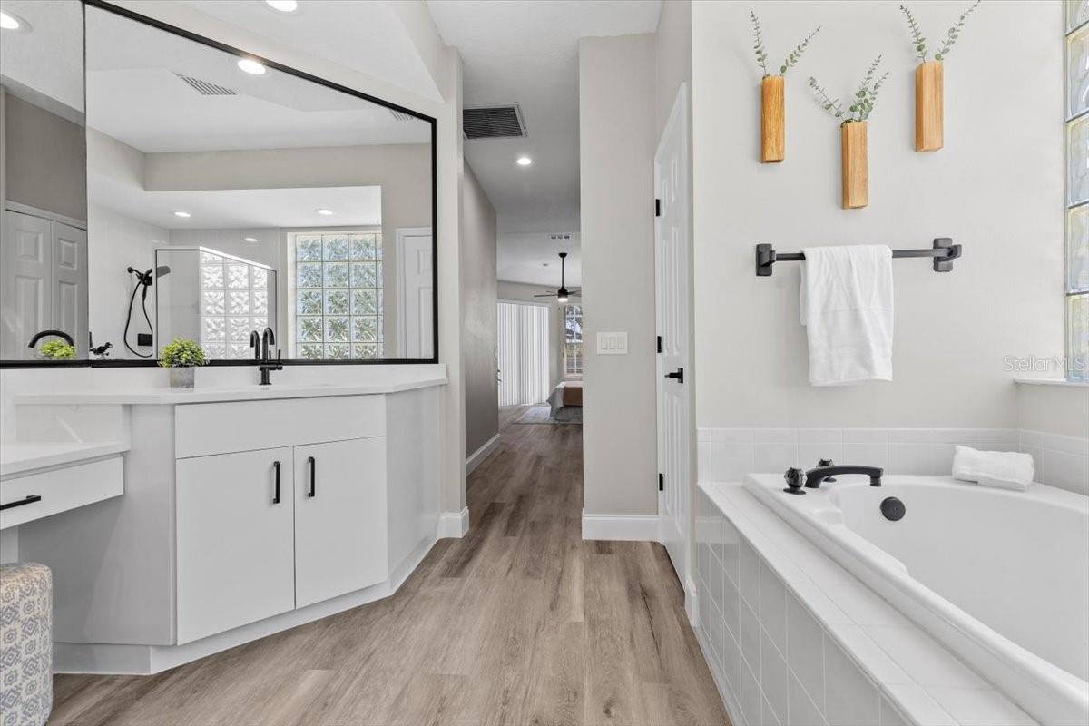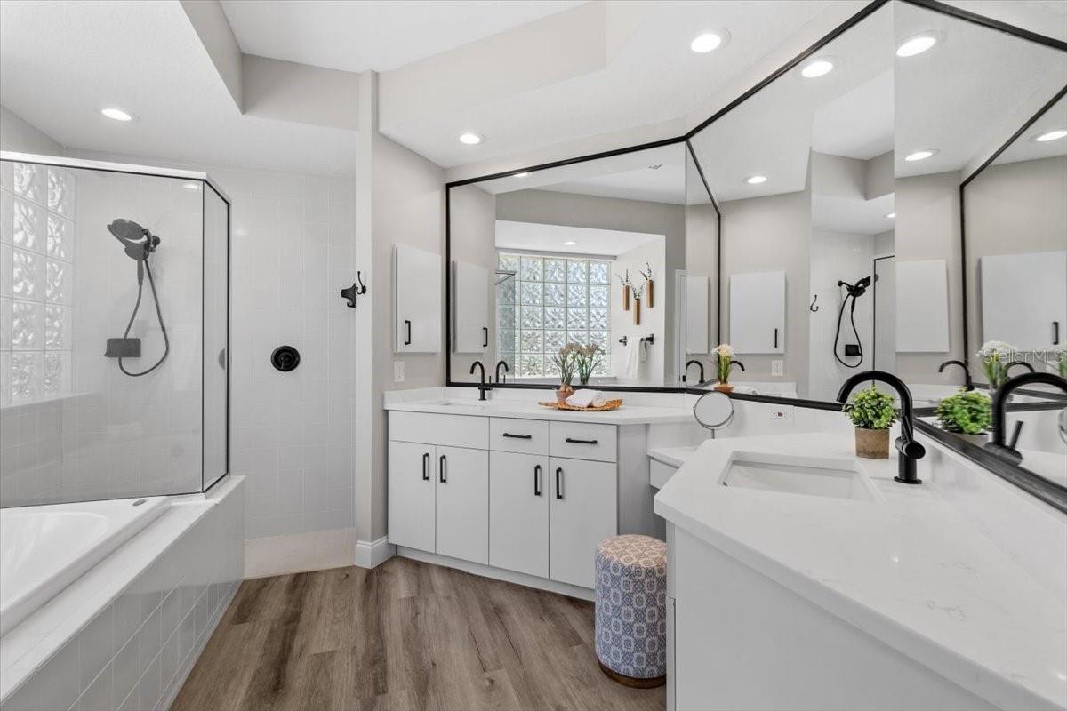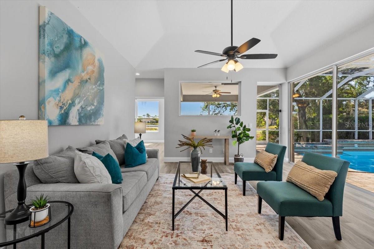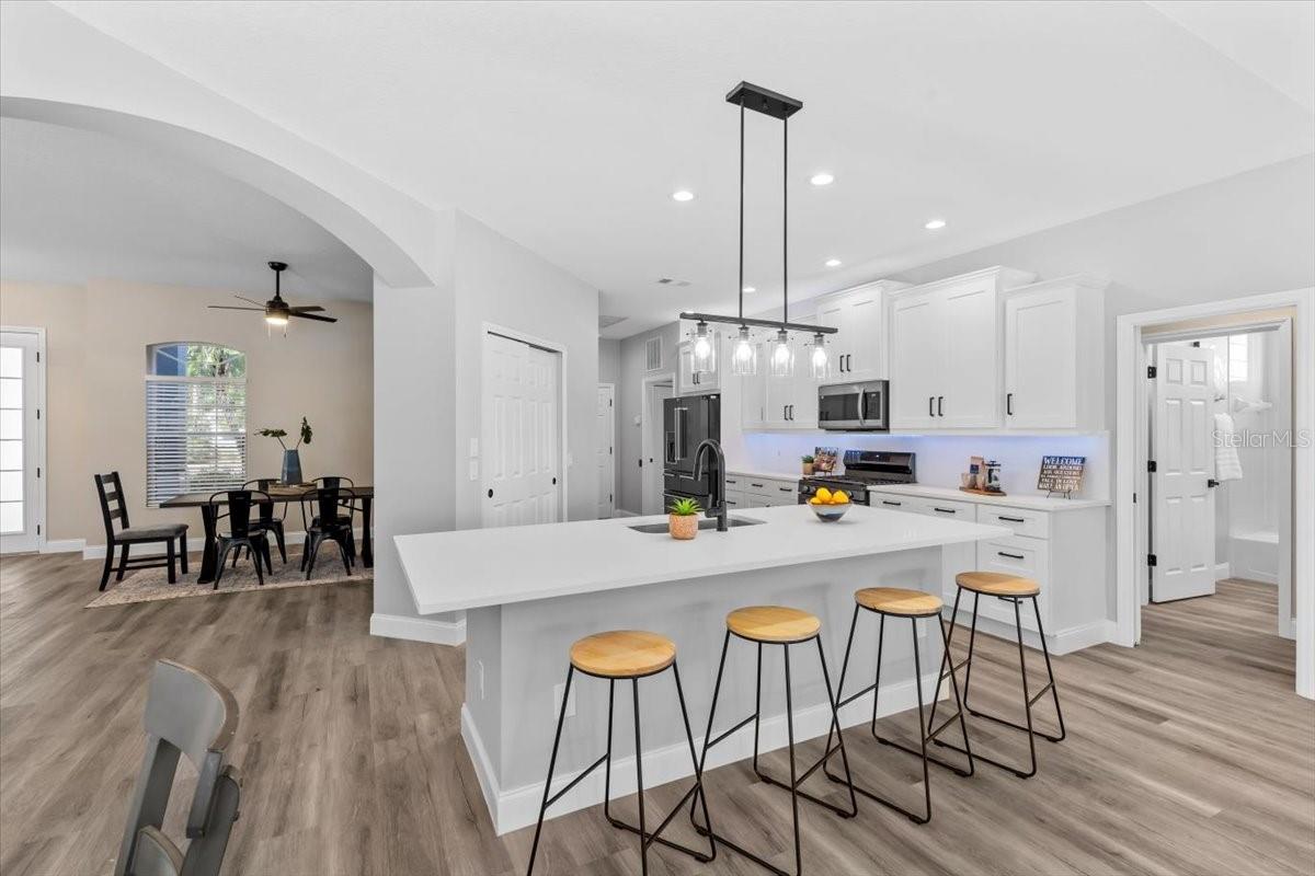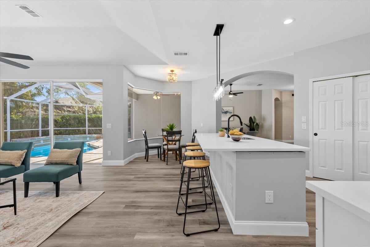 This exquisite 5-bedroom, 3-bath, 3-car garage pool home in the highly sought-after Summerfield Village of Lakewood Ranch seamlessly blends comfort and sophistication. With fresh exterior paint and updated landscaping, the curb appeal is undeniable. As you approach, a welcoming covered entryway sets the stage for what's inside. Step through the front door and be greeted by brand-new luxury vinyl flooring flowing throughout the entire home, complemented by freshly painted interiors. The dining and living areas connect effortlessly, bathed in abundant natural light from expansive sliding glass doors leading to the pool. To the right of the dining room, the first bedroom boasts built-in storage and dual closets, making it a versatile space for guests or a home office. Just beyond, the primary suite awaits--an elegant retreat with tray ceilings, two oversized walk-in closets, and private pool access. The spa-like primary bath features a soaking tub, walk-in shower, and dual vanities, offering both style and functionality. The gourmet-inspired kitchen is a masterpiece, showcasing updated white shaker cabinets, quartz countertops, black brushed stainless steel appliances, modern fixtures, recessed lighting, a pantry, and a charming breakfast nook with bay windows. A wet bar with a built-in wine rack and wine fridge enhances the space, providing ample storage and entertaining possibilities. Just off the kitchen, a generously sized laundry room offers quartz countertops and a sink for added convenience. The family room, designed for relaxation and gatherings, features tray ceilings and an abundance of natural light streaming through sliding glass doors that open to the outdoor retreat. Bedroom three includes built-in wall storage and private patio access, while bedrooms four and five offer modern fixtures and comfortable layouts. Bathrooms two and three have been stylishly updated with quartz vanities and contemporary finishes. Step outside to the expansive screened-in patio and pool area, the heart of this home. With brand-new pavers, a sparkling pool, and a soothing spa overlooking the tranquil lake and lush landscaping, this space is perfect for entertaining or unwinding in total serenity--all while enjoying the added comfort and privacy of a screened enclosure. Summerfield Village offers an array of amenities, including scenic walking trails, a playground, tennis courts, and more. With easy access to I-75, top-rated schools, fine dining, world-famous beaches, UTC Mall, and downtown Sarasota, this home delivers the ideal Florida lifestyle. Don't miss this exceptional opportunity--schedule your private showing today! For a virtual tour, click the provided link and experience the beauty of the exceptional home.