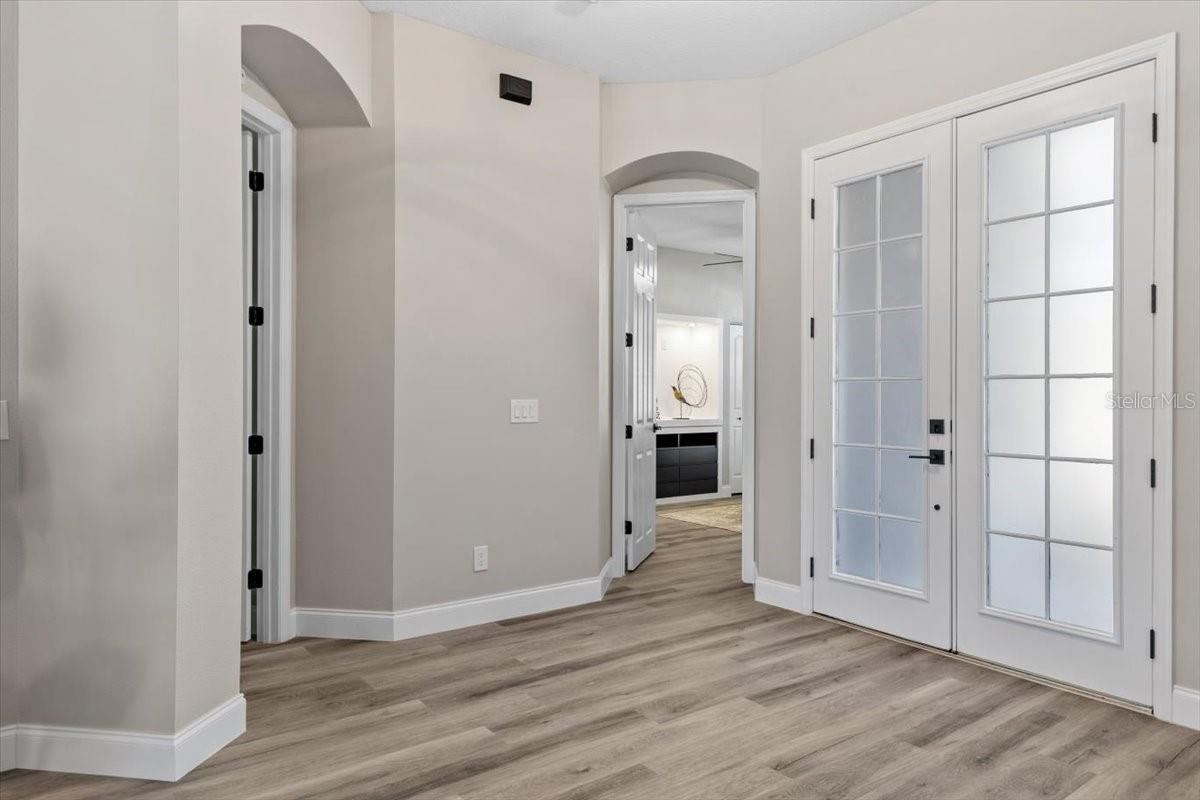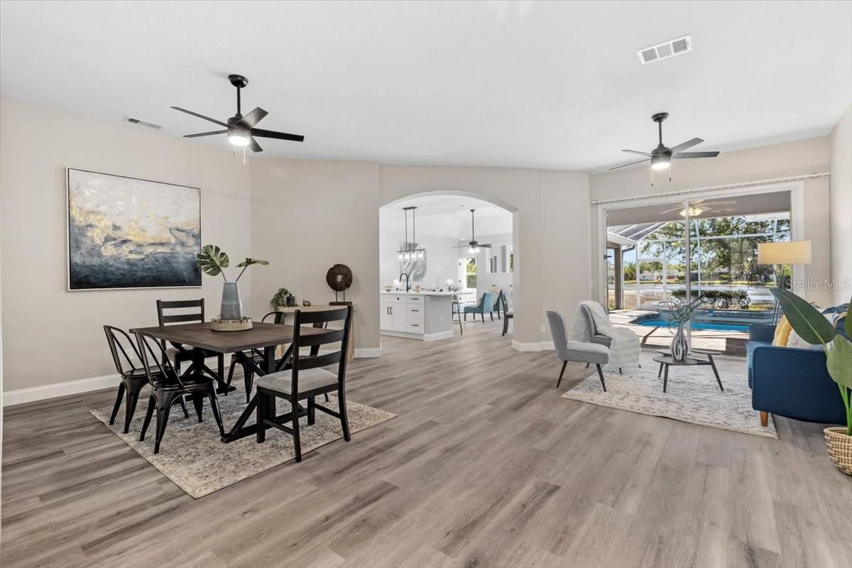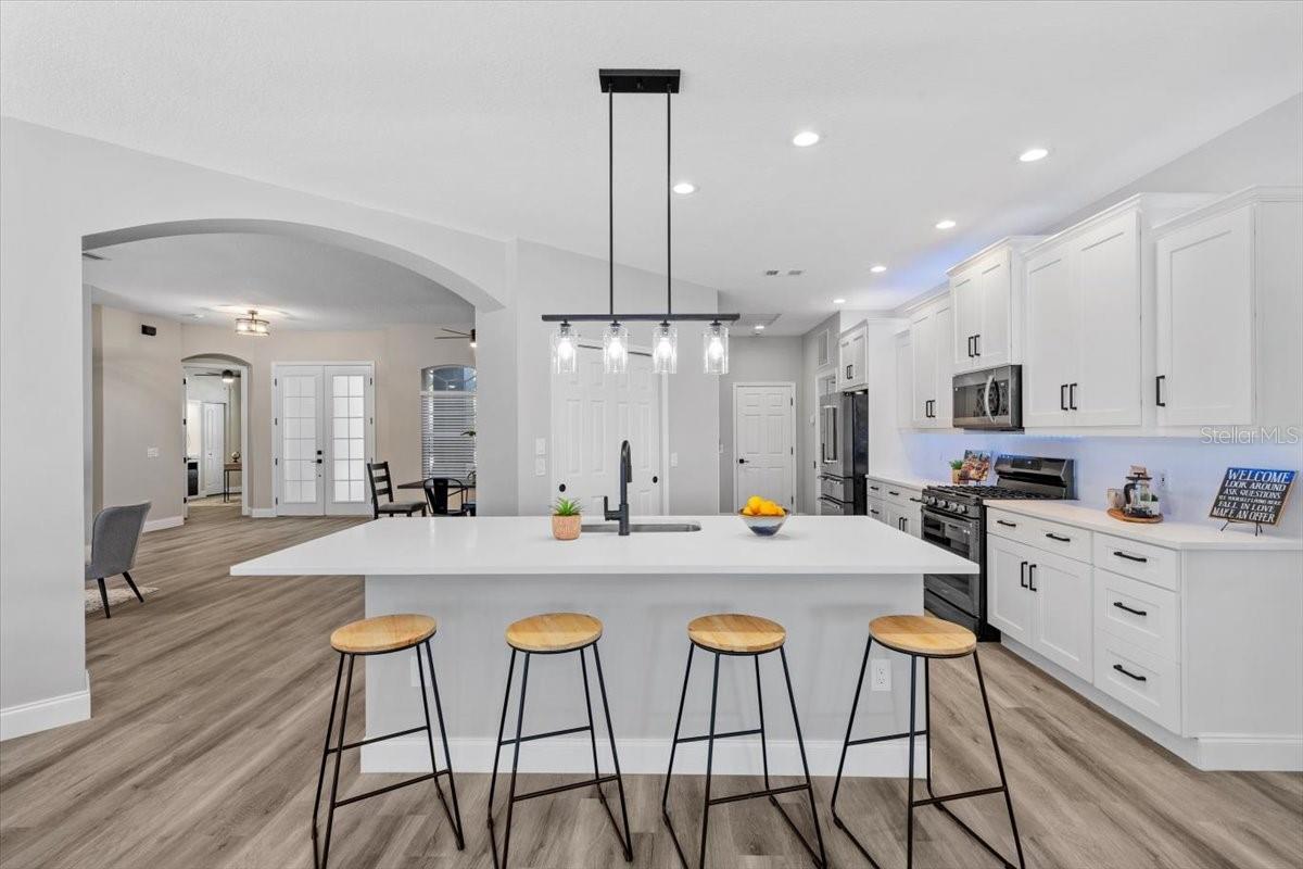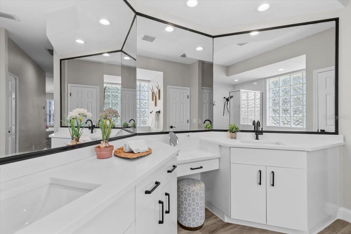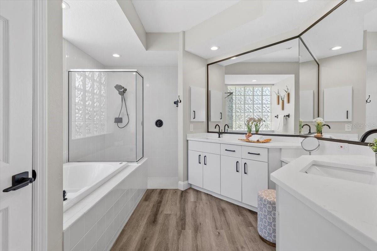 This exquisite 5-bedroom, 3-bath, 3-car garage pool home in the highly sought-after Summerfield Village of Lakewood Ranch seamlessly blends comfort and sophistication. With fresh exterior paint and updated landscaping, the curb appeal is undeniable. As you approach, a welcoming covered entryway sets the stage for what's inside. Step through the front door and be greeted by brand-new luxury vinyl flooring flowing throughout the entire home, complemented by freshly painted interiors. The dining and living areas connect effortlessly, bathed in abundant natural light from expansive sliding glass doors leading to the pool. To the right of the dining room, the first bedroom boasts built-in storage and dual closets, making it a versatile space for guests or a home office. Just beyond, the primary suite awaits--an elegant retreat with tray ceilings, two oversized walk-in closets, and private pool access. The spa-like primary bath features a soaking tub, walk-in shower, and dual vanities, offering both style and functionality. The gourmet-inspired kitchen is a masterpiece, showcasing updated white shaker cabinets, quartz countertops, black brushed stainless steel appliances, modern fixtures, recessed lighting, a pantry, and a charming breakfast nook with bay windows. A wet bar with a built-in wine rack and wine fridge enhances the space, providing ample storage and entertaining possibilities. Just off the kitchen, a generously sized laundry room offers quartz countertops and a sink for added convenience. The family room, designed for relaxation and gatherings, features tray ceilings and an abundance of natural light streaming through sliding glass doors that open to the outdoor retreat. Bedroom three includes built-in wall storage and private patio access, while bedrooms four and five offer modern fixtures and comfortable layouts. Bathrooms two and three have been stylishly updated with quartz vanities and contemporary finishes. Step outside to the expansive screened-in patio and pool area, the heart of this home. With brand-new pavers, a sparkling pool, and a soothing spa overlooking the tranquil lake and lush landscaping, this space is perfect for entertaining or unwinding in total serenity--all while enjoying the added comfort and privacy of a screened enclosure. Summerfield Village offers an array of amenities, including scenic walking trails, a playground, tennis courts, and more. With easy access to I-75, top-rated schools, fine dining, world-famous beaches, UTC Mall, and downtown Sarasota, this home delivers the ideal Florida lifestyle. Don't miss this exceptional opportunity--schedule your private showing today! For a virtual tour, click the provided link and experience the beauty of the exceptional home.
