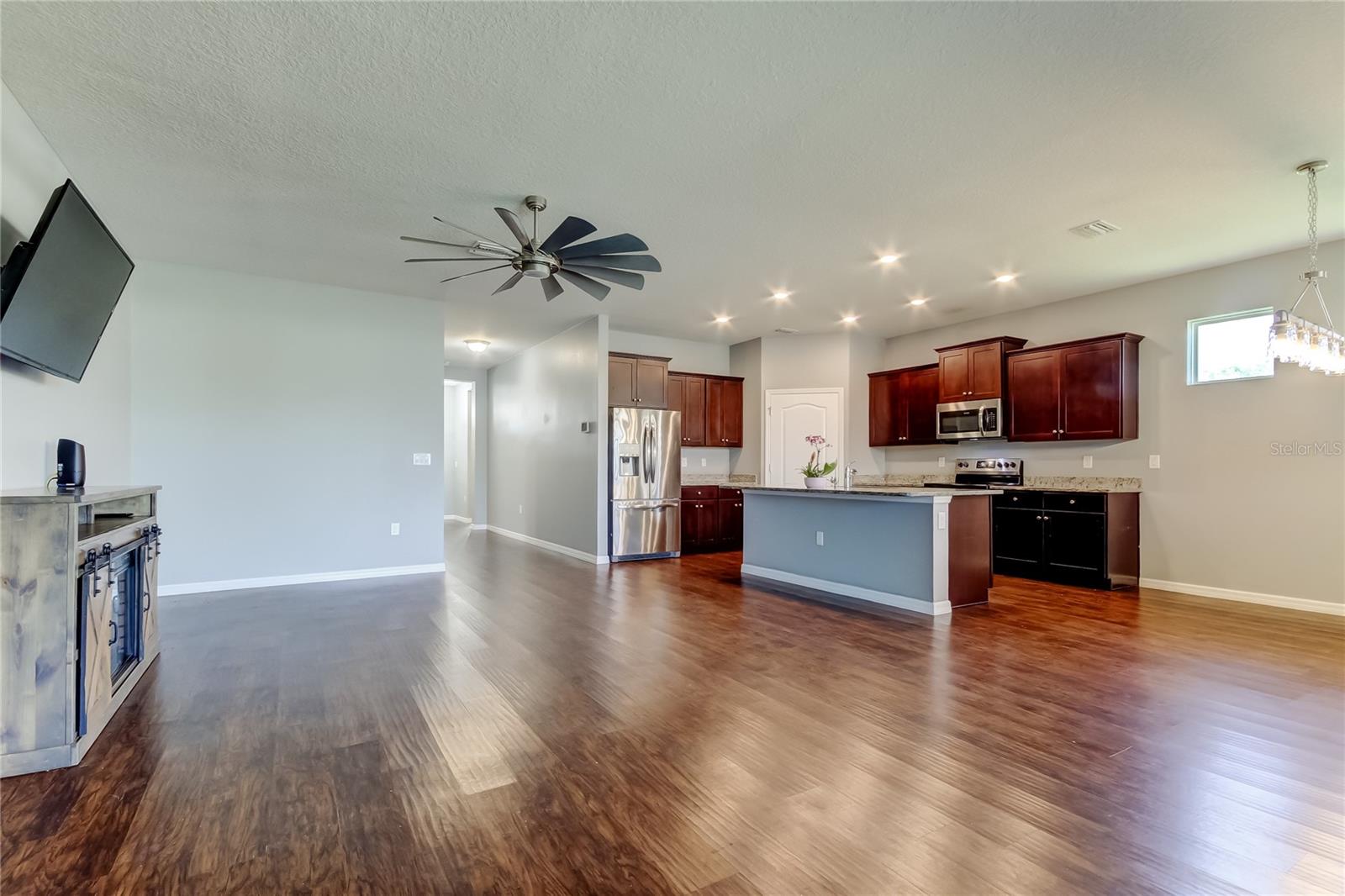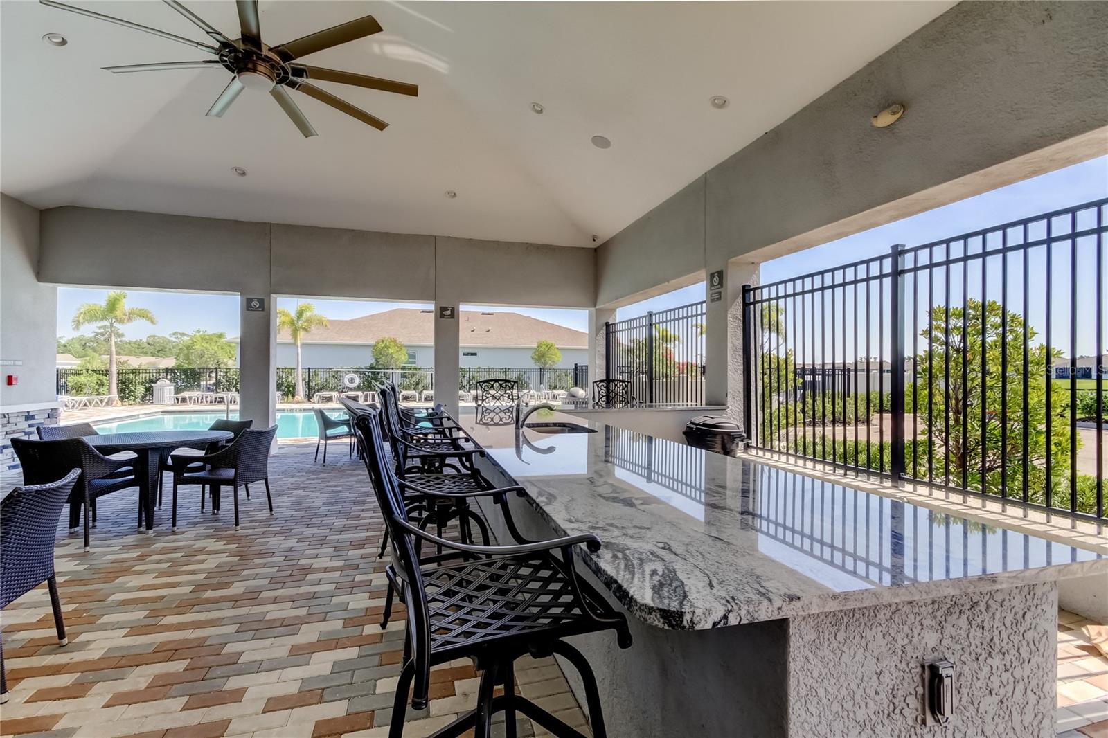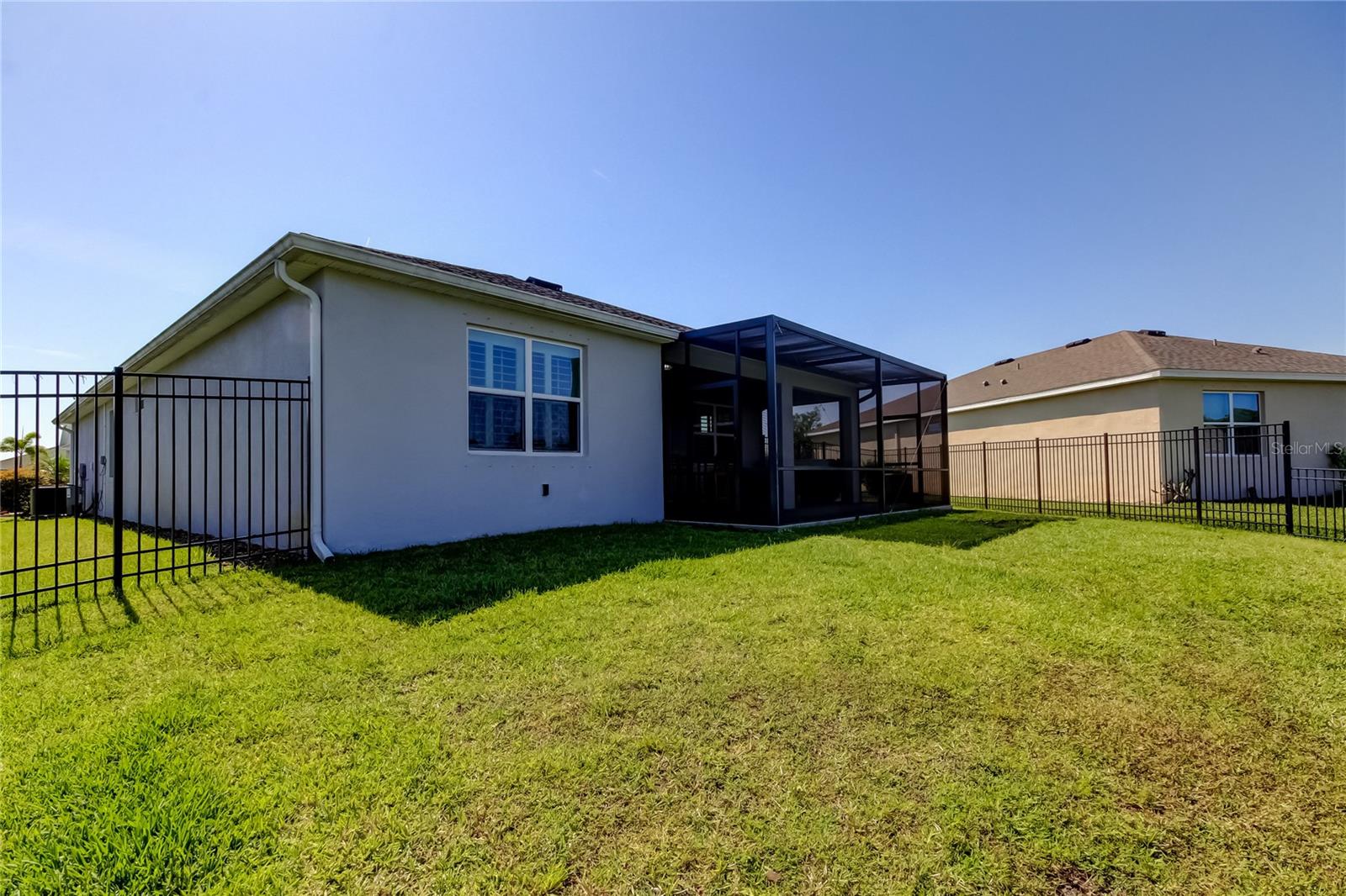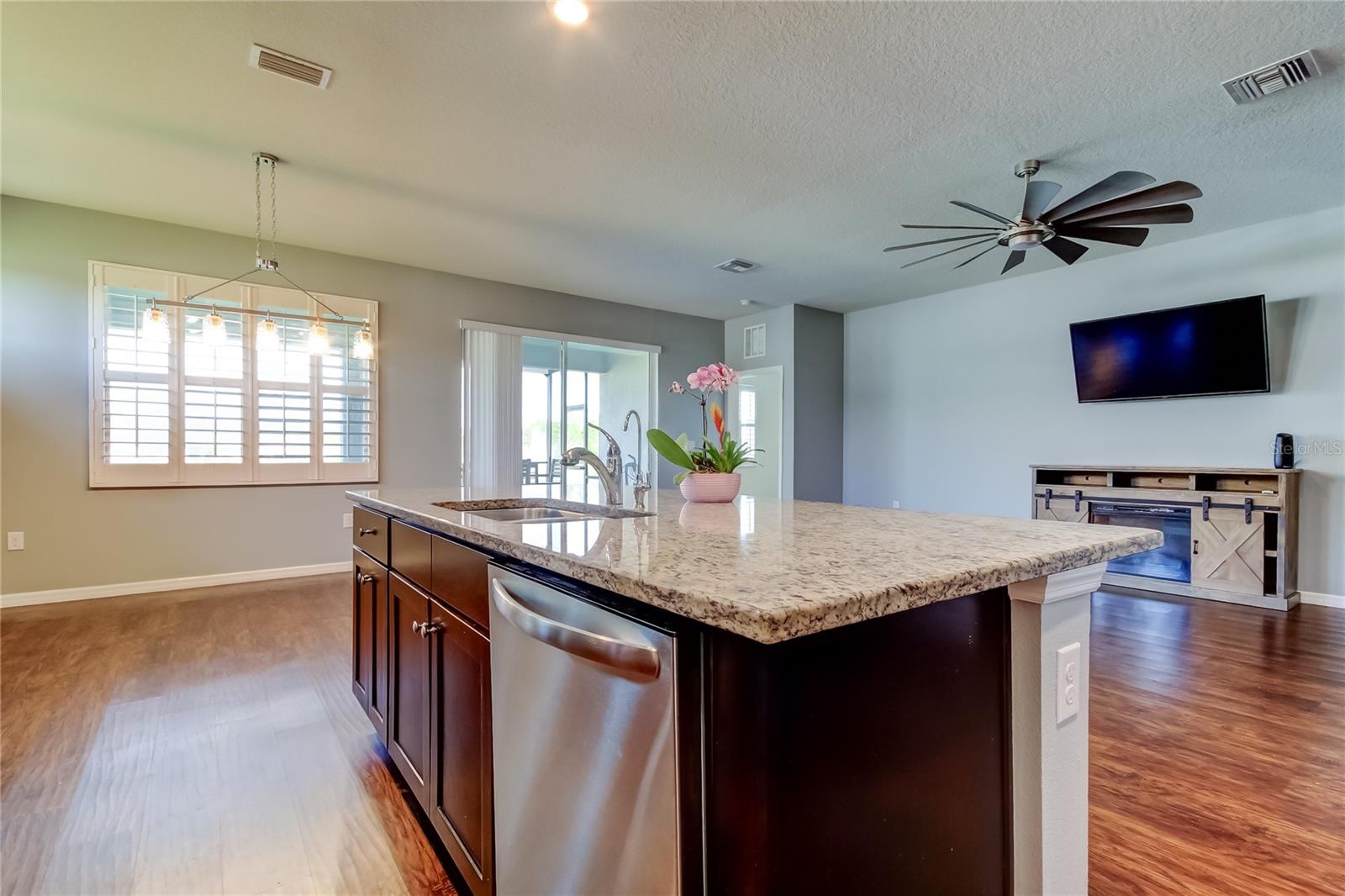 This beautifully maintained concrete block construction home features a desirable one-story layout with an open concept kitchen that flows into the spacious great room, dining area, and covered lanai--perfect for entertaining or relaxing. The owner's suite is privately situated at the back of the home with an ensuite bath, while two bedrooms share a full bathroom at the front, and a fourth bedroom is tucked near the laundry room. The kitchen includes stainless steel appliances: electric range, built-in microwave, and dishwasher.Located in the sought-after Palisades community, residents enjoy gated access, a sparkling community pool, and lawn maintenance included in the HOA, keeping the neighborhood pristine and your weekends worry-free.